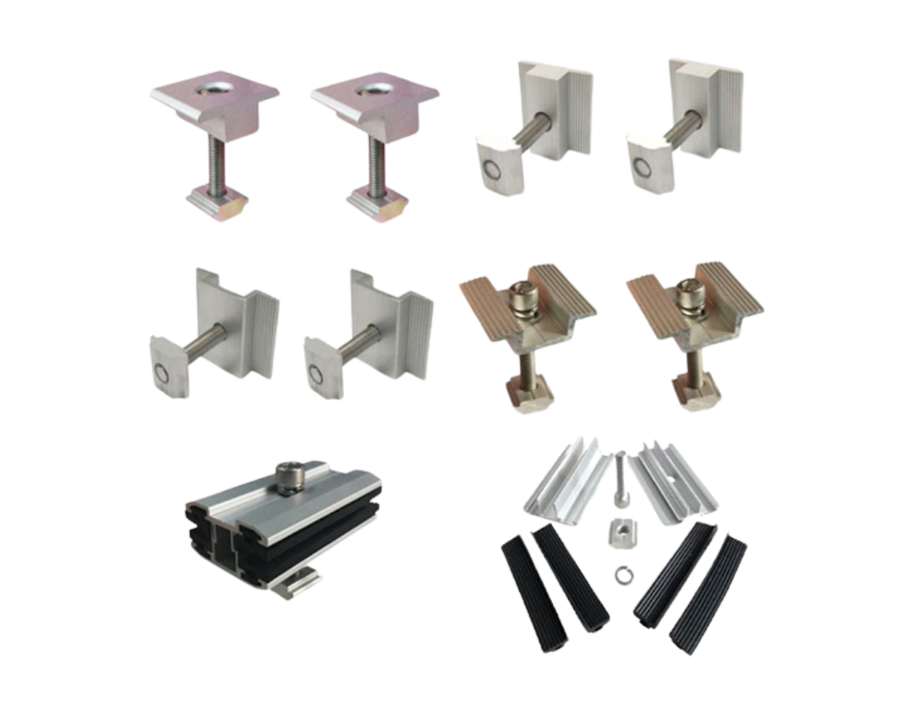 Khung và giá đỡ giúp cố định các tấm pin trên mái nhà hoặc mặt đất. Thường được làm thép hoặc nhôm. Thông thường, nó có sự kết hợp của thanh ray, kẹp cuối, kẹp giữa, giá đỡ…