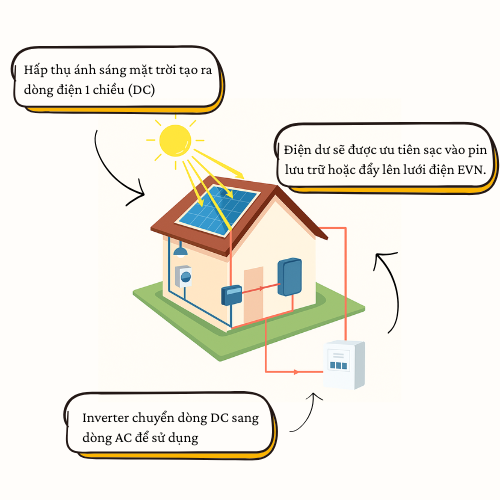 Hệ thống biến tần sẽ chuyển đổi dòng điện một chiều này thành dòng điện xoay chiều. Dòng điện xoay chiều này có cùng công suất và tần số với điện hòa lưới.